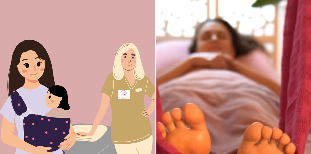 Un massage peau à peau postnatal partagé avec votre bébé ciblant la tête, les mains et les pieds, accompagné d’un massage des pieds au bol Kansu et d’un serrage du bassin avec le châle Rebozo.
